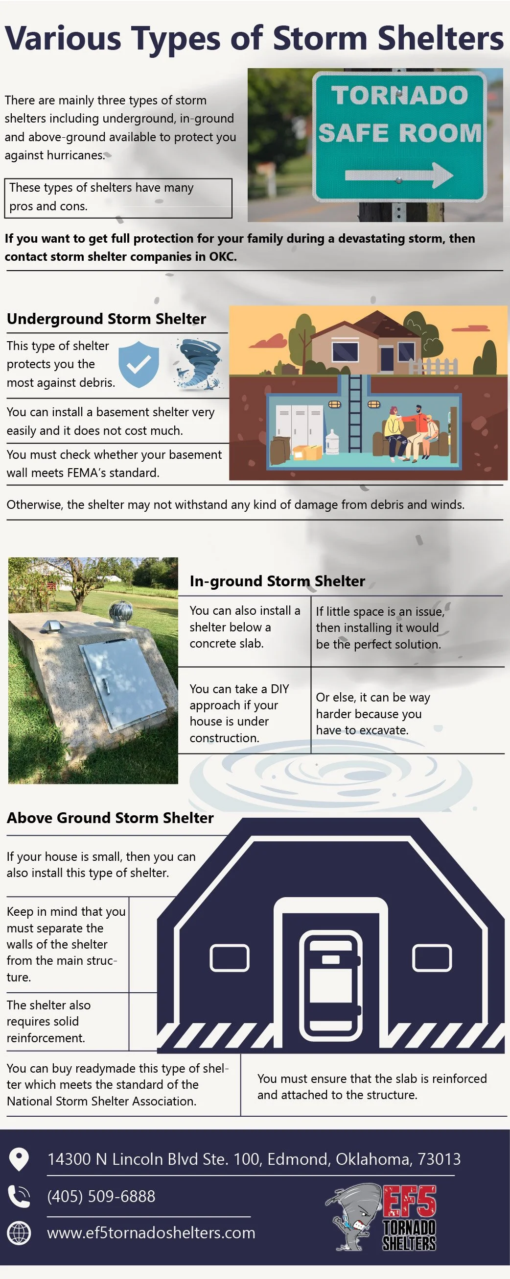According to the report, various states including OKC in the United States are prone to storms like tornadoes. Therefore, you should purchase or build a storm shelter to ensure full protection of your family members. There are various types of storm shelters - underground, in-ground and above-ground. If you have a lot of space on your property, then consider building an underground storm shelter. It protects you the most against debris. But before making it, you should check whether your basement wall meets FEMA’s standard. Apart from that, you can also install a shelter below a concrete slab. You can build it by yourself if your house is under construction. If small space is an issue for you, then purchasing above ground storm shelter would be the best decision. You can buy a readymade shelter that meets the standard of the national Storm Shelter Association. If you want to make sure that your family is safe during the storm, then contact storm shelter companies in OKC.